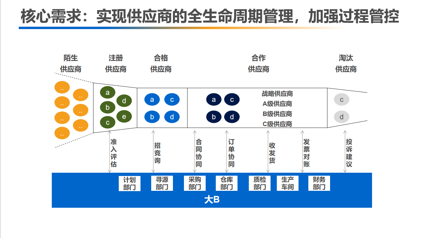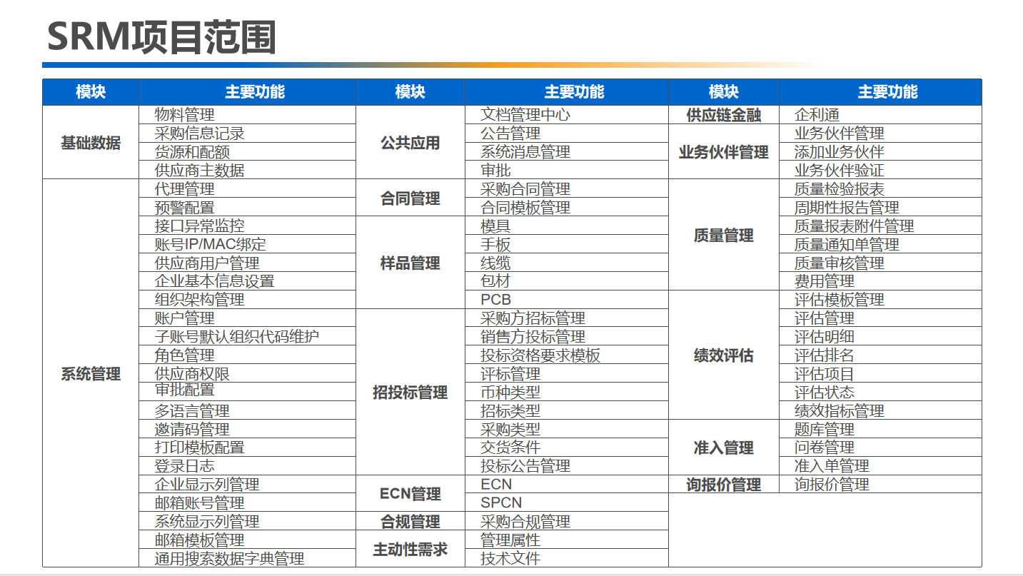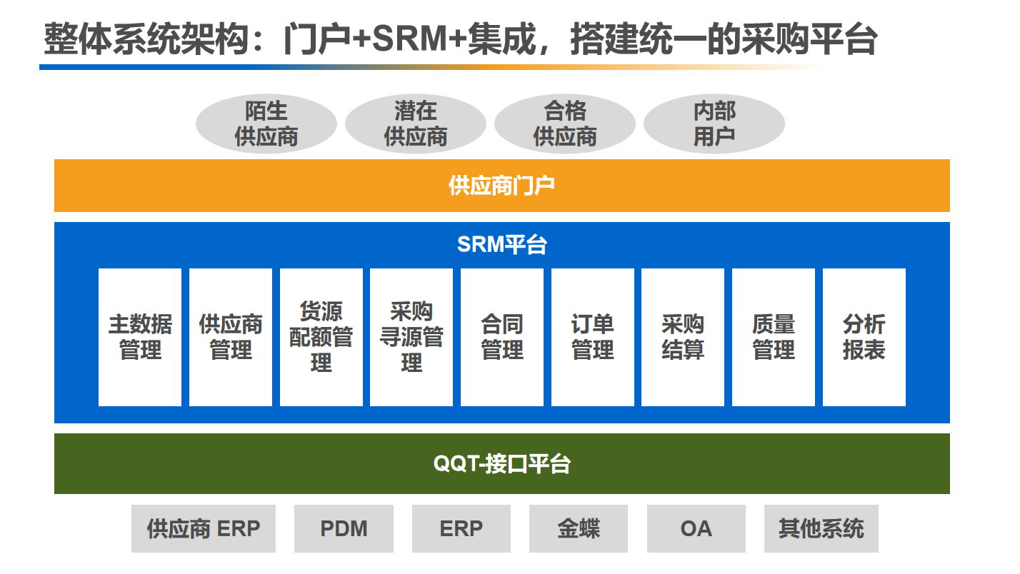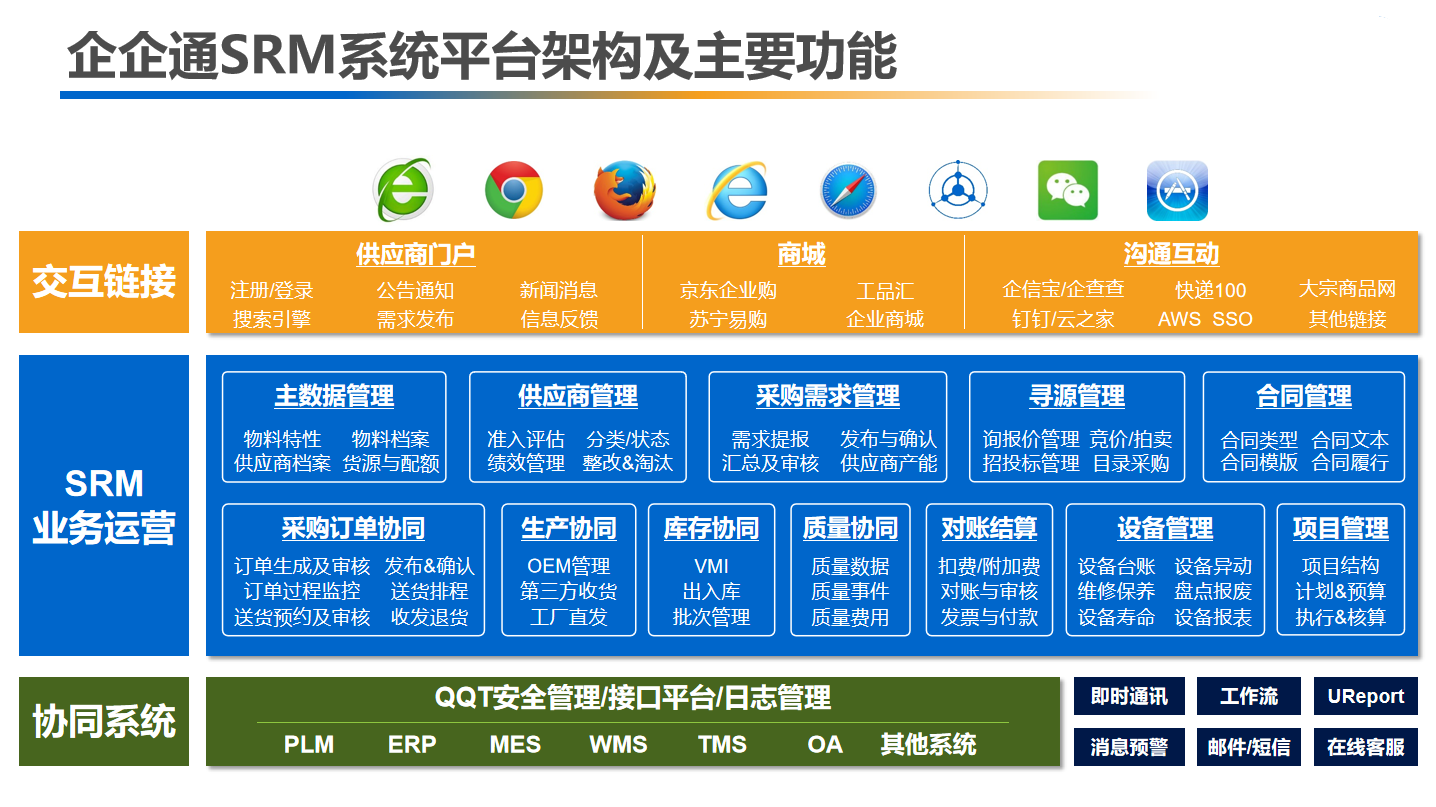 SRM产品广泛应用于供应商比较多、对供应商管理要求较高的企业,实现供应商全生命周期管理、采购订单管理、合同管理、采购计划管理、质量管理等功能,通过系统实现对供应商全生命周期管理、采购订单协同及内部采购作业规范化、标准化,提升采购部门业务效率。交付方式 : SAAS